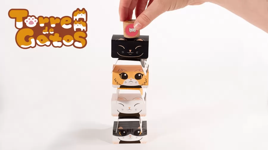 A los gatos les encantan los pescados, pero no pueden alcanzarlos sólos. Ayúdales a subirse unos sobre otros y así poder alcanzar su ansiado almuerzo. Lanza el dado, dobla las cartas y apílalas para llegar a lo más alto. Pero ten cuidado, ¡no dejes caer la Torre de Gatos!