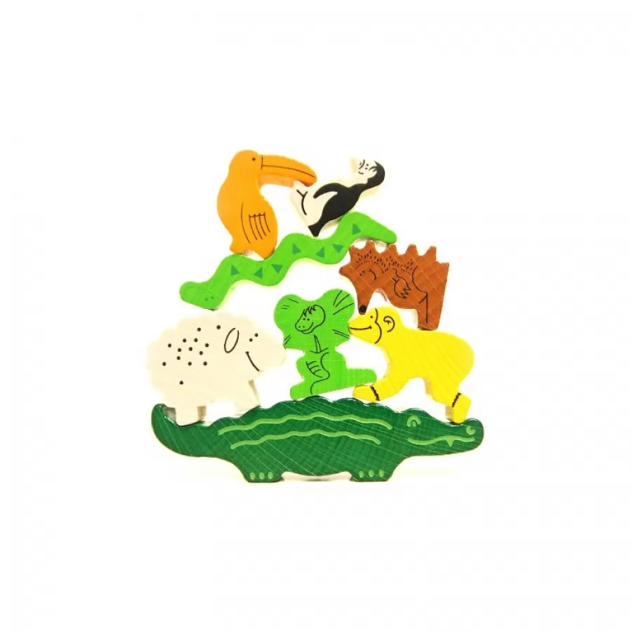 A los animales les encanta ejecutar su número más espectacular: ¡la gran pirámide! ¿Quién conseguirá colocar el pingüino sobre el cocodrilo, la oveja sobre el pingüino, la serpiente sobre la oveja, el tucán...?