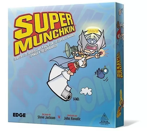 Sé un Mutante, Exótico, Místico o Tecnificado superheroico, acumula Poderes como Estirabilidad, Brutal Eructo Cervecero o el clásico Tirar Rayos por los Ojos, lucha contra temibles supervillanos como El Hombre Miniatura, El Peluche Satánico, o Nuestro Viejo Amigo el Devorador de Planetas, y LLÉVATE SUS COSAS. Con la ayuda de objetos como las Botas del Calibre .50 o la Licencia de Demolición y de alguno de esos lamentables Compinches que siempre te acompañan, ningún enemigo podrá detenerte. Super Munchkin es un juego completo. Presenta por primera vez los Poderes, con sus correspondientes (y ridículos) Orígenes, pero sigue siendo compatible con toda la línea Munchkin.