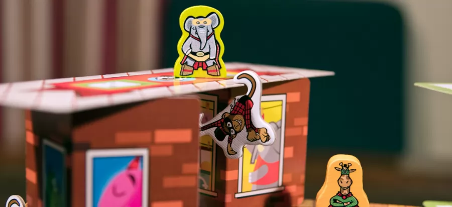 Rhino Hero y sus amigos superhéroes viven infinidad de aventuras en el rascacielos de cartas. Pero, cuidado, porque el rascacielos es cada vez más alto e inestable a medida que se le van añadiendo cartas. El que tire el dado con habilidad, mueve a sus superhéroes hacia arriba y defiende su lugar en las batallas contra otros jugadores… si no fuese por los monos-araña, que hacen tambalear el rascacielos.