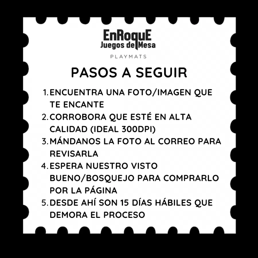 POR FAVOR NO HACER LA COMPRA HASTA CORROBORAR CON EL EQUIPO ENROQUE QUE EL DISEÑO QUE QUIERES SEA REALIZABLE. NOS PUEDES CONTACTAR A ITALO@JUEGOSENROQUE.CL O A TRAVÉS DE NUESTRAS REDES SOCIALES