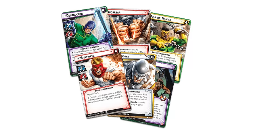 Las 73 cartas nuevas que contiene este escenario ponen a los cuatro Villanos en juego a la vez, cada uno con un Plan secundario y un mazo propios. ¿Podrán vuestros Héroes volver a meter entre rejas a Destructor, Martinete, Bulldozer y Bola de Trueno?