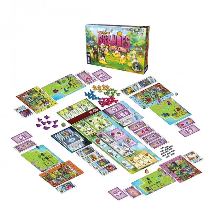 Como es habitual en la familia de juegos “Pequeños grandes…” del mismo autor, este título incluye un gran número de componentes en muy poco espacio. A través de 75 peones de dinosaurios (15 de 5 especies diferentes), peones de rancheros y capataces y varios mazos de cartas, Pequeños grandes dinosaurios logra crear una experiencia de juego muy entretenida en la que cada tipo de jugador encontrará un reto a su medida. Esto incluye también a los amantes del modo en solitario, pues este título cuenta con un ingenioso sistema de IA gestionado por un mazo de cartas de acción que supondrá un verdadero reto.