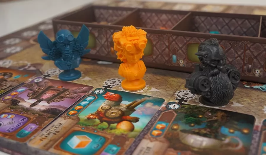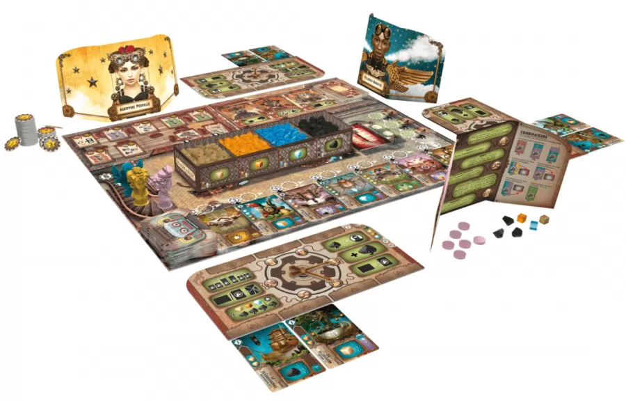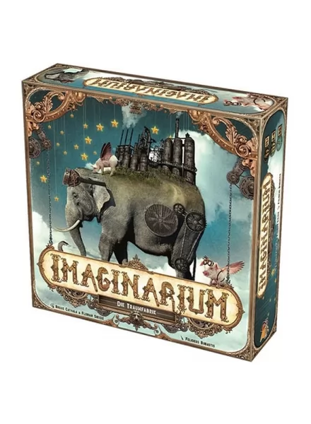 ¡Bienvenido a tu primer día de trabajo en la factoría de sueños! ¡He aquí las famosas máquinas! Puedes repararlas, combinarlas o desmontarlas; estas producirán los recursos y el carbonium necesario para reparar otras máquinas más poderosas. Confío en que, para poder realizar los proyectos de la oficina de diseño, usarás los recursos y el espacio en tu taller de la mejor manera posible. Todo un reto para un humilde manitas como tú. En Imaginarium repararás, desmontarás y usarás las curiosas máquinas del Cajón de sastre para conseguir carbonium (dinero) y recursos (madera, cobre y cristal) que son esenciales para completar los proyectos. También puedes reclutar ayudantes para que te faciliten el trabajo, que es la mejor manera para conseguir puntos de victoria si quieres ganar la partida, pero ¡debes ser más rápido que los demás jugadores! Componentes del juego 1 tablero central 5 modelos de plástico 5 tableros de jugador 1 caja de almacenamiento 60 cubos de madera 70 cubos de plástico 70 gemas de plástico 80 fichas de madera 65 fichas de cartón 74 cartas 14 losetas 1 Libro de Reglas