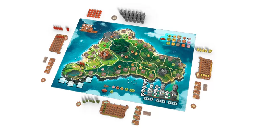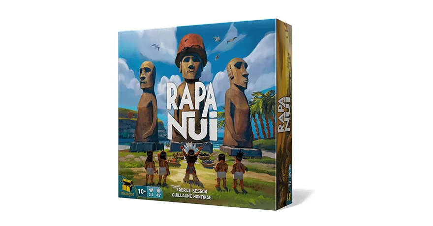 ¡Conviértete en el cacique de uno de los clanes de Rapa Nui y participa en la gran aventura de construir moáis, los famosos gigantes de la isla de Pascua! 1- Distribuye a tus aldeanos. 2- Esculpe moáis. 3- Transporta tus moáis y adórnales la cabeza con un pukao. 4- ¡Transforma tus recursos en ofrendas y hazte con la victoria!